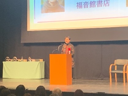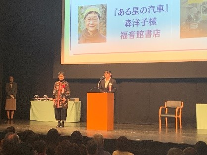 (左)「キノベス!キッズ」選考代表として、受賞作『ある星の汽車』の魅力を語る新宿本店の都野佳乃。(中)トロフィーを受け取る森洋子様。(右)受賞スピーチにて制作秘話を語る森様。