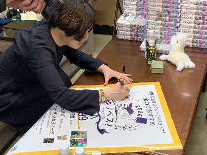 (左)「キノベス!」選考代表としてスピーチを行うイトーヨーカドー木場店の宮澤紗恵子。(中)受賞スピーチにて感謝の言葉を述べる村田沙耶香様。(右)控室でポスターにサインを行う村田様。