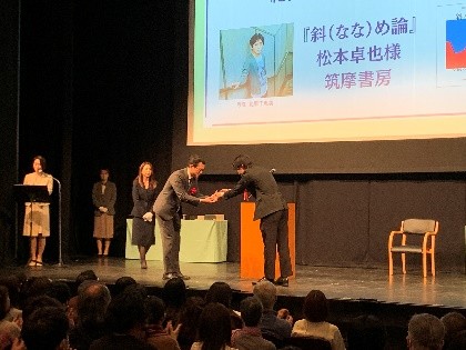 (左)「紀伊國屋じんぶん大賞」選考代表として推薦理由を語る東京営業本部木村颯。(中)フランスに滞在中で出席が叶わなかった松本卓也様に代わりトロフィーを受け取る筑摩書房編集部の柴山浩紀様。(右)ビデオメッセージにて喜びの言葉を述べる松本様。