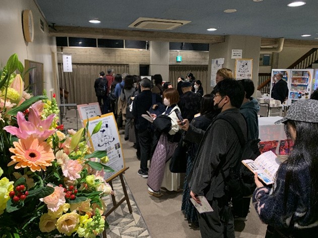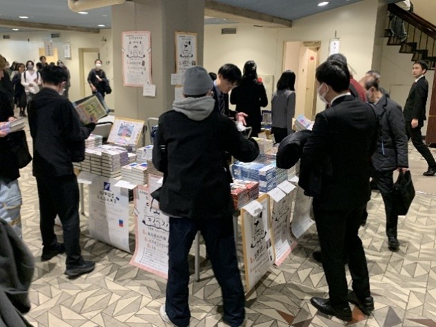 (左)開場を待ちわびる参加者の列。(右)ホワイエにて受賞作品のほか、ランキング入りした本を購入する参加者。