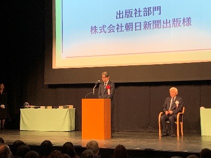 (左)代表取締役会長の高井昌史より、ベストセラー大賞出版社部門の贈賞を受ける朝日新聞出版代表取締役社長の圓満亮太様。(中)スピーチを行う圓満様。(右)ベストセラー大賞著者部門を受賞した吉田修一様のメッセージを代読する朝日新聞出版書籍編集部・文芸編集委員の池谷真吾様。